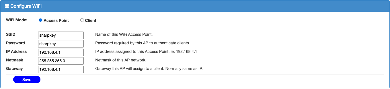 Access Point mode. | Once the SharpKey has been configured and you selected AP Mode in the WiFi Manager, pressing the WiFi switch for 2-5 seconds will enter Access Point mode. | This mode is where you have selected Access Point mode via the WiFi Manager menu in the browser configuration. You can change the network name (SSID), password and IP address range to suit your requirements. In this mode you will always connect to the SharpKey by joining its network in the WiFi settings menu of your computer or phone and access the configuration web page using the settings you provided. |