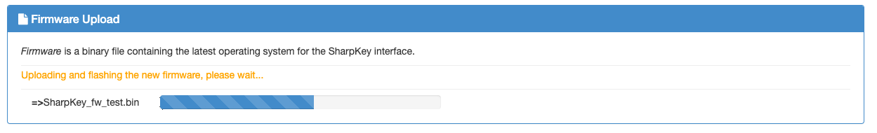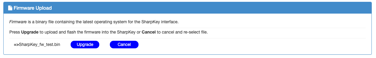 In order to upgrade the firmware, click on the Select file button in the Firmware Upload panel and choose a stored or downloaded firmware image. Validation will occur before programming so if you choose the wrong image, the SharpKey will refuse to update. Validation will also check the version and block the update if the version chosen is the same as the current firmware. Once selected, the panel will update as follows: