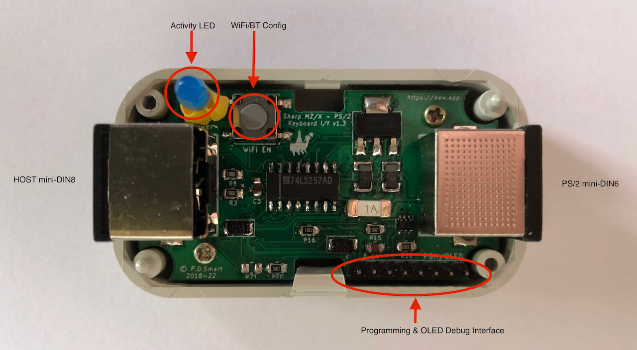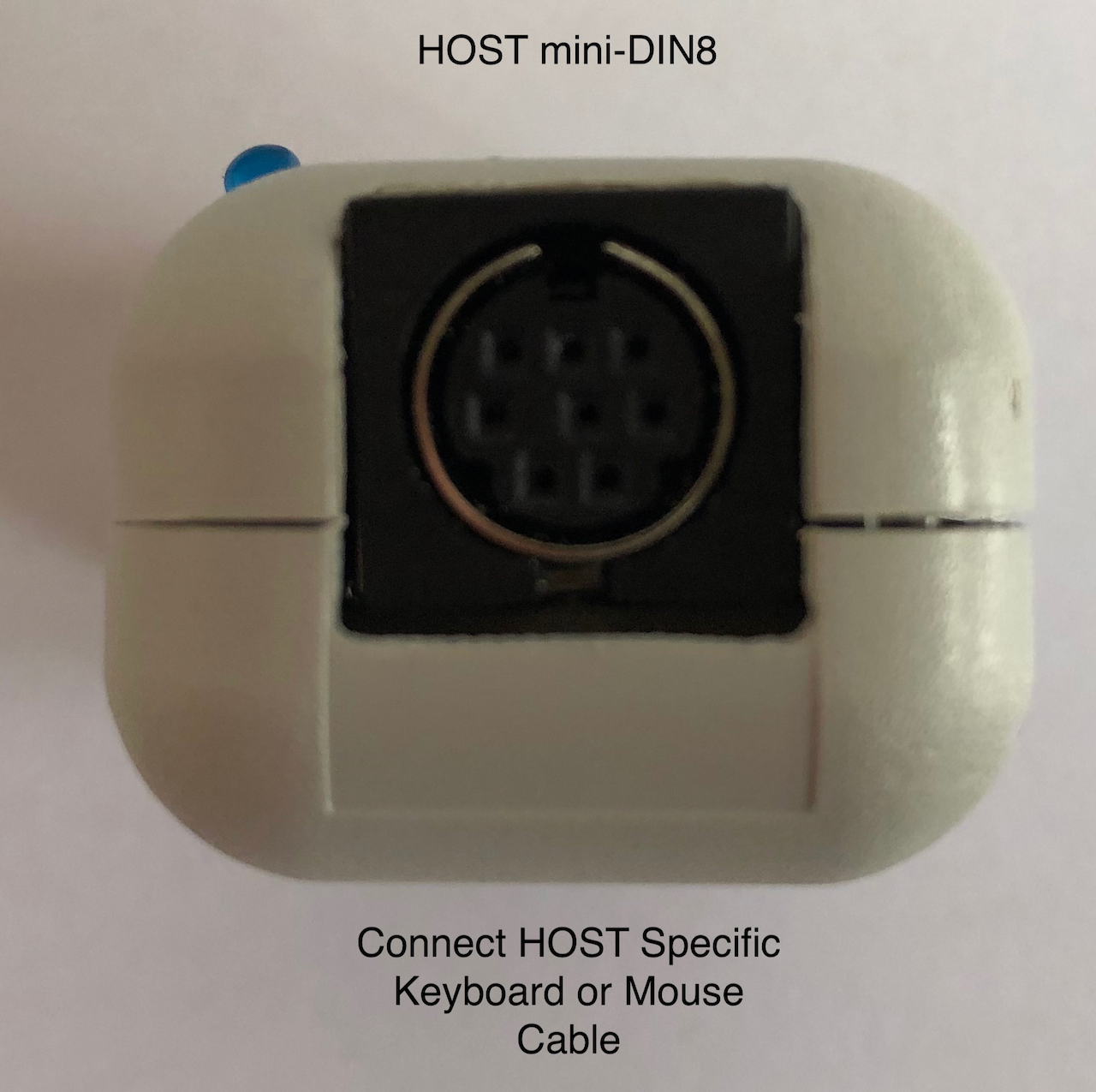 On the left is the HOST connector, this is an 8pin mini-DIN female socket into which a HOST specific cable is plugged. The cable interfaces the SharpKey to either a mouse or keyboard port on a particular host, ie. Sharp MZ-2800.