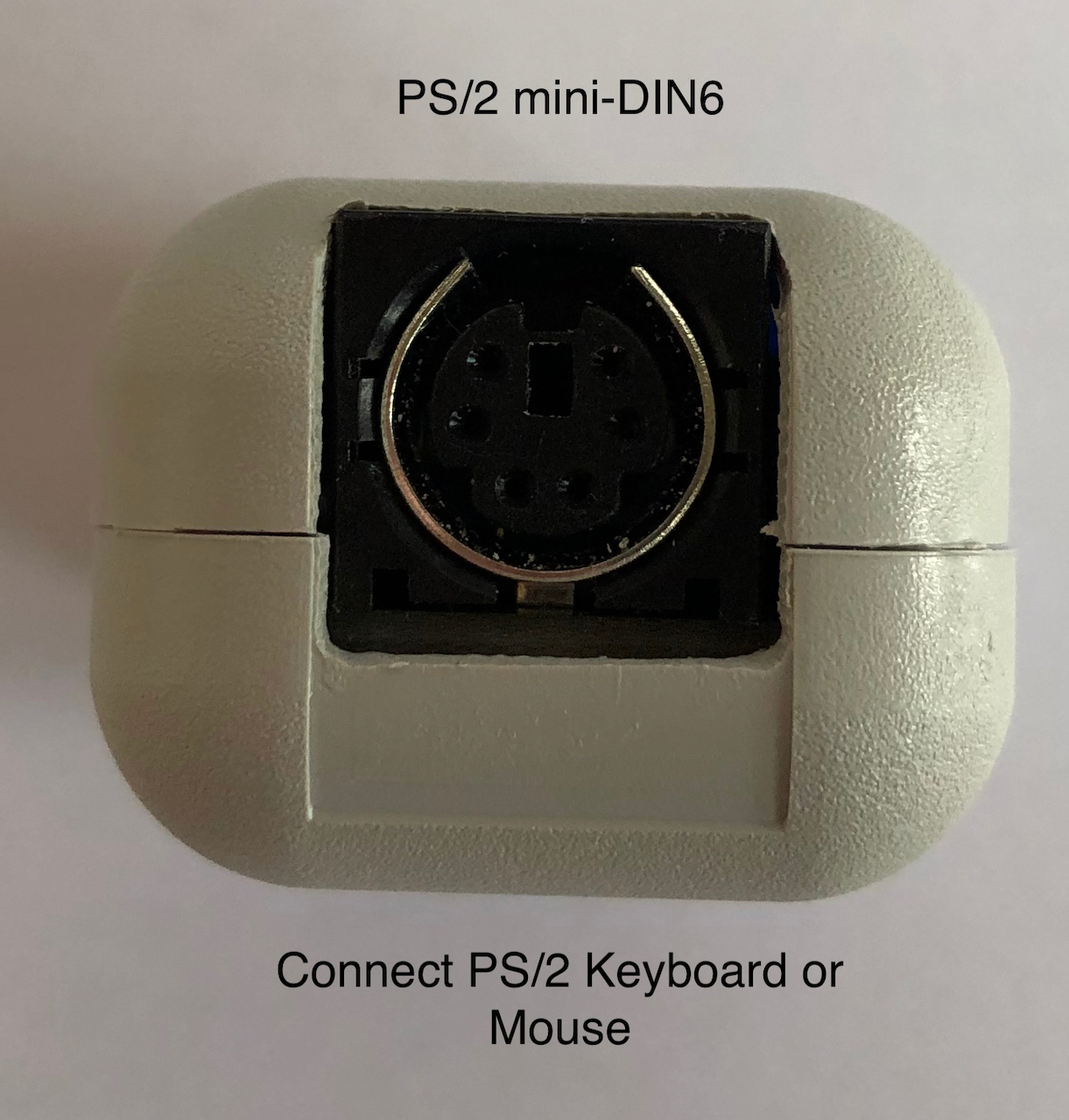On the right is the PS/2 connector, this is a 6pin mini-DIN female socket into which a PS/2 keyboard or PS/2 mouse is plugged. This socket is hot-swappable so it is possible to unplug a device and re-insert it whilst the interface is powered on. Plugging a different device of the same type is possible but changing from a keyboard to a mouse/vis-a-viz is not possible as it would require the HOST cable to be changed as well (ie. if the HOST side is connected to the keyboard input of a Sharp X68000 and the PS2 side to a PS/2 Keyboard, you would need to change the HOST side to a X68000 mouse cable if you wanted to connect a PS/2 Mouse).