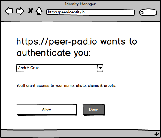 When the application requests the IdentityManagerClient to authenticate the user, a popup pointing to the IdentityManager authenticate screen is open (via window.open). In this screen, the user is asked to choose an identity and to disclose some information, such as its name, its photo and a set of claims & proofs. If the user consented the disclosure of this information and entered the Device Private Key passphrase correctly, a new session for this application will be created and stored. The session data (including the signed Session Public Key) is sent back to the application. If the user denied the disclosure of the information, the operation will fail.