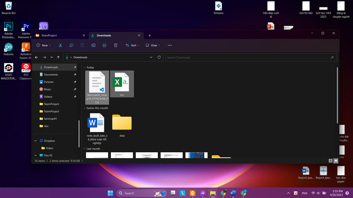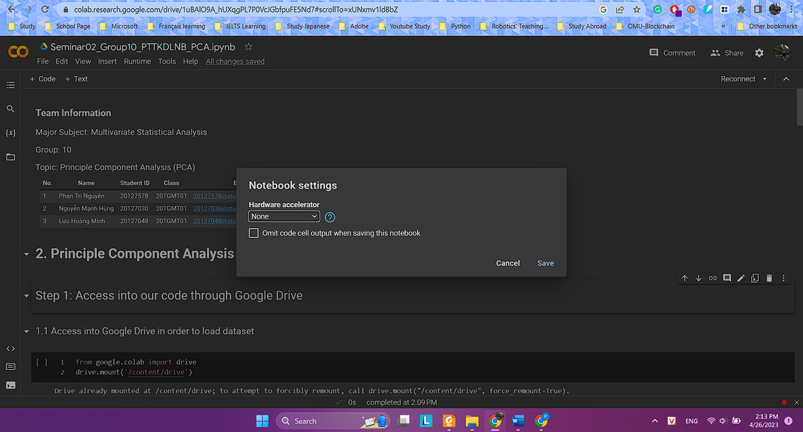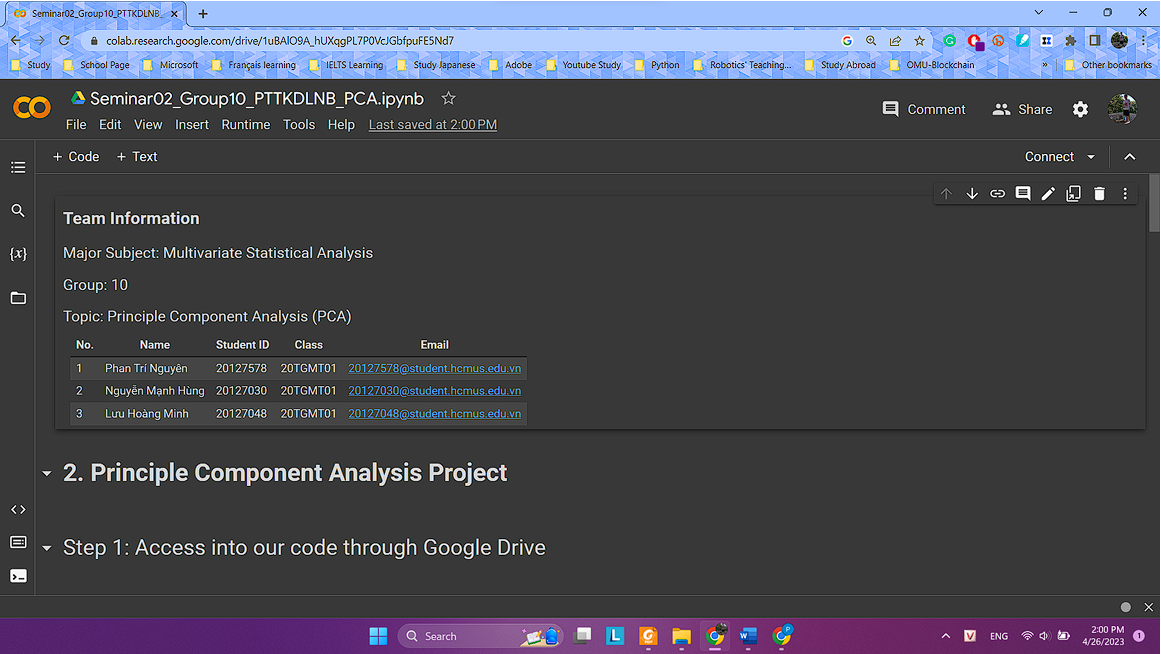 - Next, click on the Choose File frame, a File Folder will appear, the user selects the file Seminar02_Group10_PTTKDLNB_PCA which is the source code of the group, select Open and wait for Google Colab to open the source code. If the user screen displays the source code as shown below, it means the user has successfully opened the group's program.