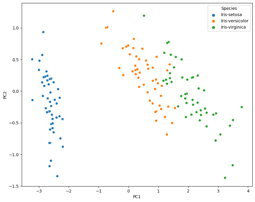 - Furthermore, the chart indicates that the first principal component (PC1) is more crucial than the second principal component (PC2) in distinguishing Iris species. PC1 captures approximately 92% of the total variability in the data, while PC2 accounts for only about 6%. This suggests that the majority of information in the data can be explained by PC1.