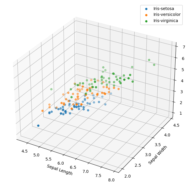 - Based on the chart presented in the table above, we can observe a clear separation among the three species of Iris: Setosa, Versicolor, and Virginica. Setosa stands out distinctly from the other two species, forming a distinct cluster in the bottom-left corner of the plot. On the other hand, data points for the Versicolor and Virginica flowers are somewhat overlapping, yet still forming two separate clusters in the top-right corner of the plot. This may lead to the conclusion that Versicolor and Virginica share similarities in appearance (sepals and petals), while Setosa exhibits relatively distinct features in appearance compared to the other two species.