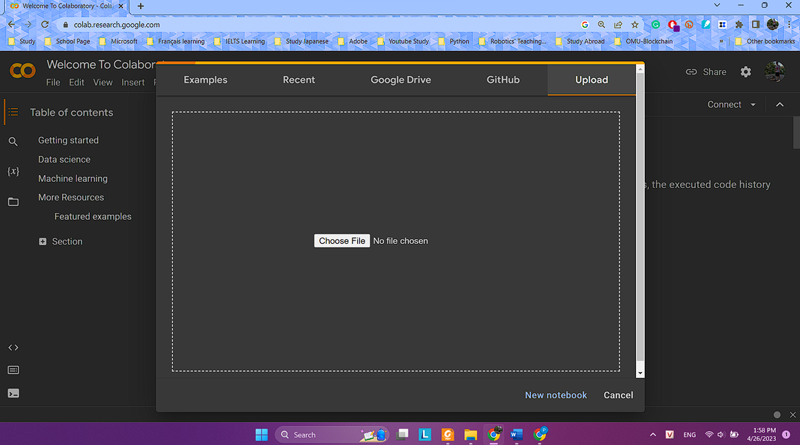 - Step 2: Once you have obtained the PCA source code and the Iris.csv dataset, users should upload the source code onto Google Colaboratory to run the program. Open the Google Colaboratory in your web browser. Next, click on "File" in the top-left corner of the Colab interface. After that select "Upload" from the dropdown menu. Then Choose the PCA source code file that you have downloaded to upload it to Google Colab.