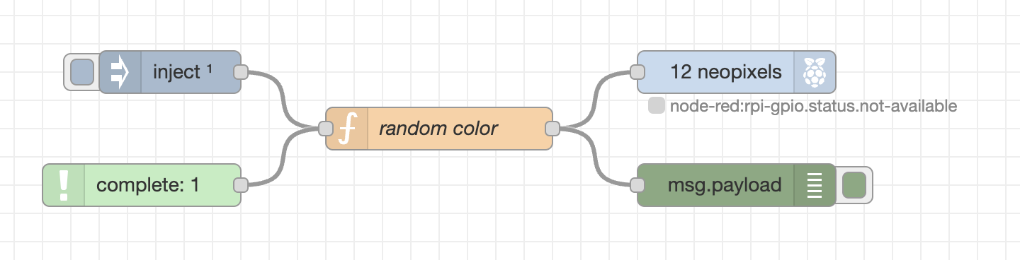 [ { "id": "8471ec6d0c159c31", "type": "tab", "label": "neopixel demo", "disabled": false, "info": "", "env": [] }, { "id": "745e35dcb1b1886b", "type": "inject", "z": "8471ec6d0c159c31", "name": "", "props": [ { "p": "payload" } ], "repeat": "", "crontab": "", "once": true, "onceDelay": 0.1, "topic": "", "payload": "red,green,blue,white,cyan,yellow,purple,orange", "payloadType": "str", "x": 150, "y": 180, "wires": [ [ "5d799e649b54a1a3" ] ] }, { "id": "eb234d064a2a6930", "type": "rpi-neopixels", "z": "8471ec6d0c159c31", "name": "", "gpio": 18, "pixels": "12", "bgnd": "", "fgnd": "", "wipe": "40", "mode": "pcent", "rgb": "grb", "brightness": "100", "gamma": false, "x": 550, "y": 180, "wires": [] }, { "id": "2420e7cde0ed735b", "type": "debug", "z": "8471ec6d0c159c31", "name": "", "active": true, "tosidebar": true, "console": false, "tostatus": false, "complete": "payload", "targetType": "msg", "statusVal": "", "statusType": "auto", "x": 550, "y": 260, "wires": [] }, { "id": "0d1014c10414c0e3", "type": "complete", "z": "8471ec6d0c159c31", "name": "", "scope": [ "eb234d064a2a6930" ], "uncaught": false, "x": 130, "y": 260, "wires": [ [ "5d799e649b54a1a3" ] ] }, { "id": "5d799e649b54a1a3", "type": "function", "z": "8471ec6d0c159c31", "name": "random color", "func": "const colors = context.get(\"colors\")\n\ndo {\n msg.payload = colors[Math.trunc(Math.random() * colors.length)];\n} while (context.get(\"previous\") === msg.payload);\n\ncontext.set(\"previous\", msg.payload);\n\nreturn msg;\n", "outputs": 1, "noerr": 0, "initialize": "const colors = [\"red\",\"green\",\"blue\",\"white\",\"cyan\",\"yellow\",\"purple\",\"orange\",\"black\",\"pink\"]\n\ncontext.set(\"colors\", colors);\n", "finalize": "", "libs": [], "x": 340, "y": 220, "wires": [ [ "eb234d064a2a6930", "2420e7cde0ed735b" ] ] } ]The Neopixels node works with the M5Atom Matrix which has a 5x5 grid of Neopixels. It should work with any Neopixels strand you have attached to your MCU.