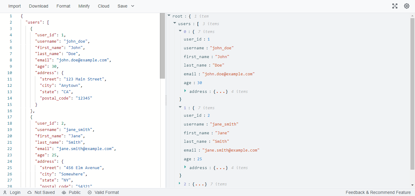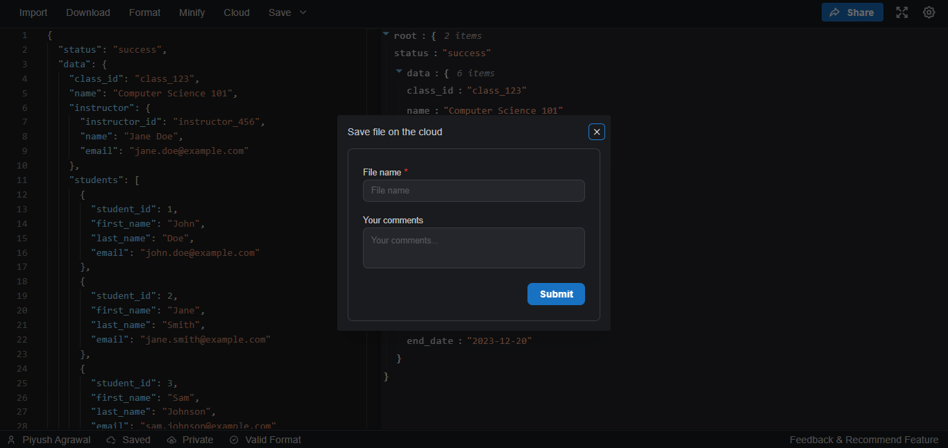 JSON Viewer is a web application built with Next.js that allows users to perform various operations on JSON files. Users can upload JSON files, format them for human readability, minify them, save the formatted JSON, and share it with others.