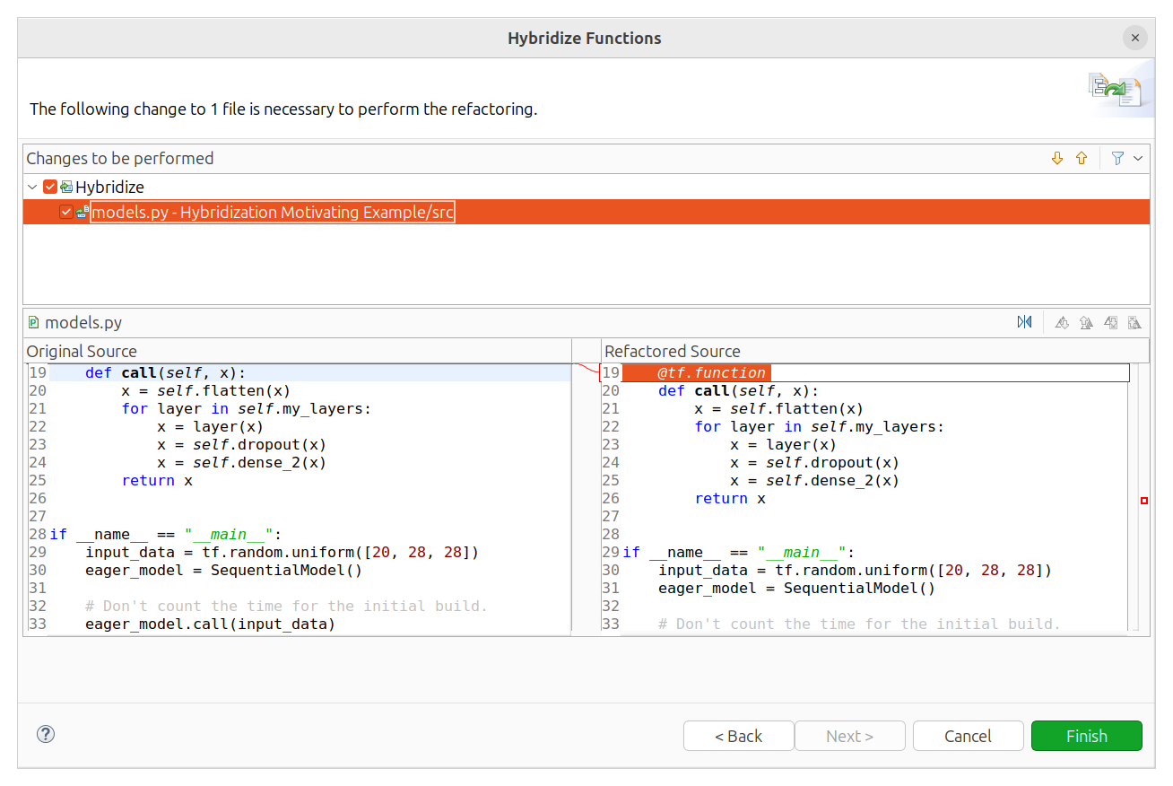 This tool consists of automated refactoring research prototype plug-ins for Eclipse PyDev that assists developers in writing optimal imperative Deep Learning code in a semantics-preserving fashion. Refactoring preconditions and transformations for automatically determining when it is safe and potentially advantageous to migrate an eager function to hybrid and improve upon already hybrid Python functions are included. The approach utilizes the WALA Ariadne static analysis framework that has been modernized to TensorFlow 2 and extended to work with modern Python constructs and whole projects. The tool also features a side-effect analysis that is used to determine if a Python function is safe to hybridize.