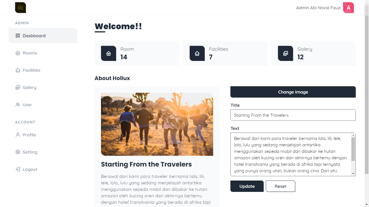Admin can manage room data, facilities, and manage galleries that will be displayed to users or guests.