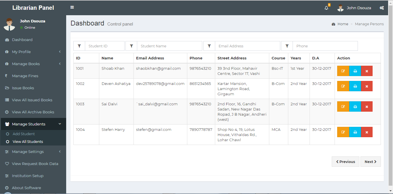 These are all the list of books that are available in the library.If Any books goes out of stock then status (All Issued) will be shown to the students.He can also see a preview of these books via(Google Book Api)