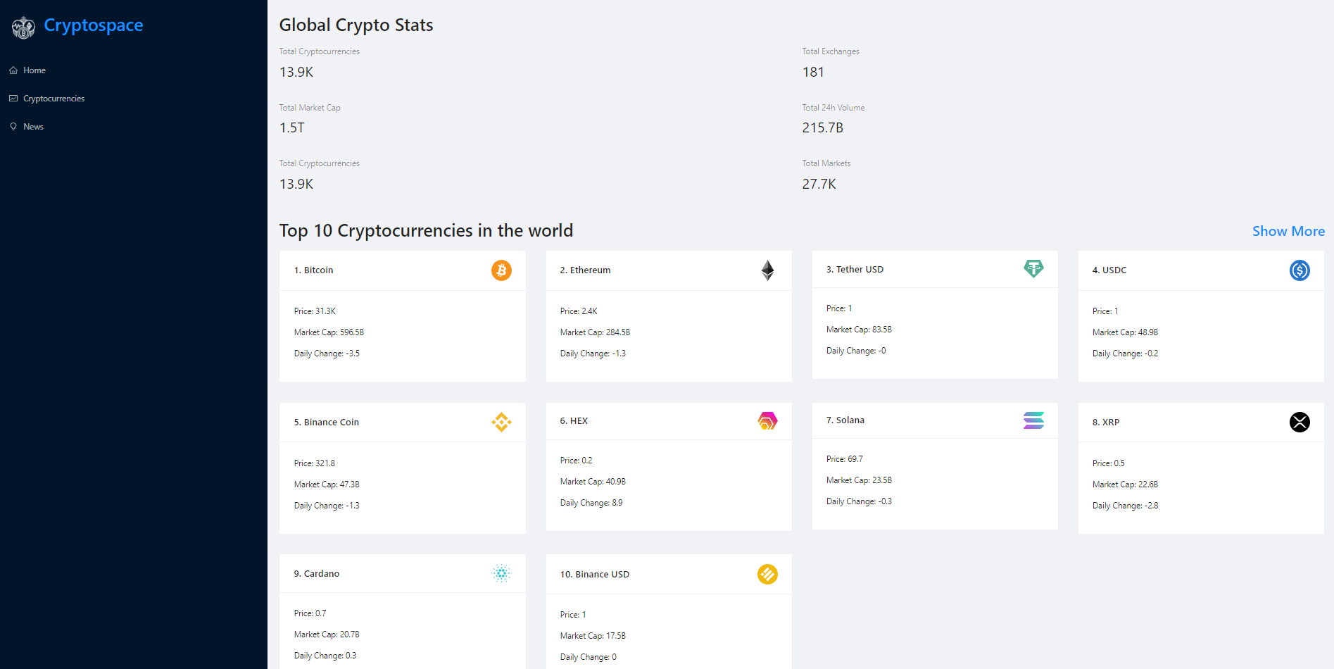 Originally I wanted to build an application that allowed users to look over crypto prices and news. I started this process by using the create-react-app boilerplate, then adding antdesign , redux , redux toolkit , axios , chart.js , html-react-parser , millify , moment and react-chartjs-2. I use Coinranking and bing news api from Rapid API, make sure you subscribe these before you start running the application.