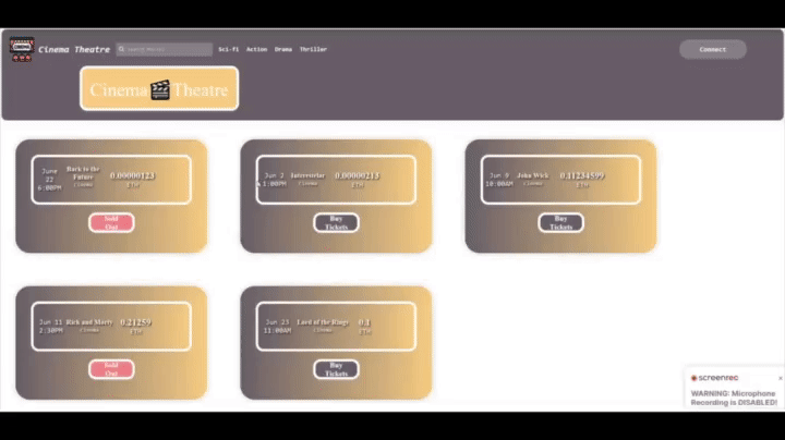 Cinema is an innovative ticketing app that uses blockchain technology to offer you a unique experience. You can select your seat and buy movie tickets at your nearest Cinema Theatre. Using Sepolia testnet and Solidity smart contracts, Cinema brings you transparency in every transaction. In addition, ReactJS integration and MetaMask wallet ensure an attractive user interface and secure transactions.