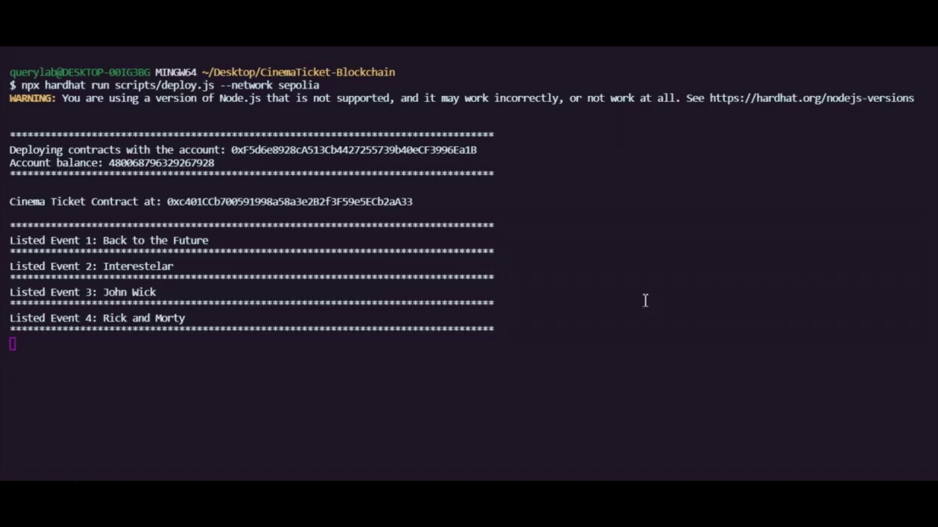 $ npx hardhat compile$ npx hardhat run scripts/deploy.js --network sepolia#After deploying the CinemaTicket.sol replace this address in src/config.json file with the variable: