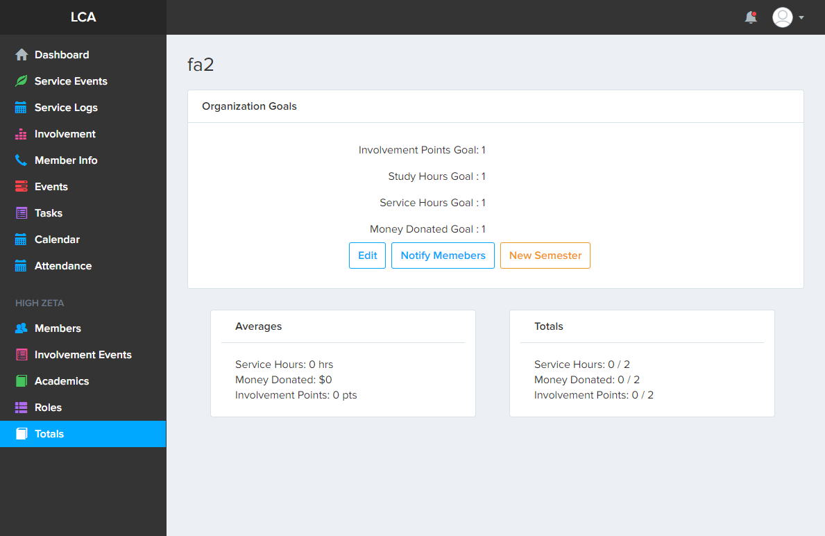 - Totals (Track the progress of the organization; total service hours, money donated, etc.)