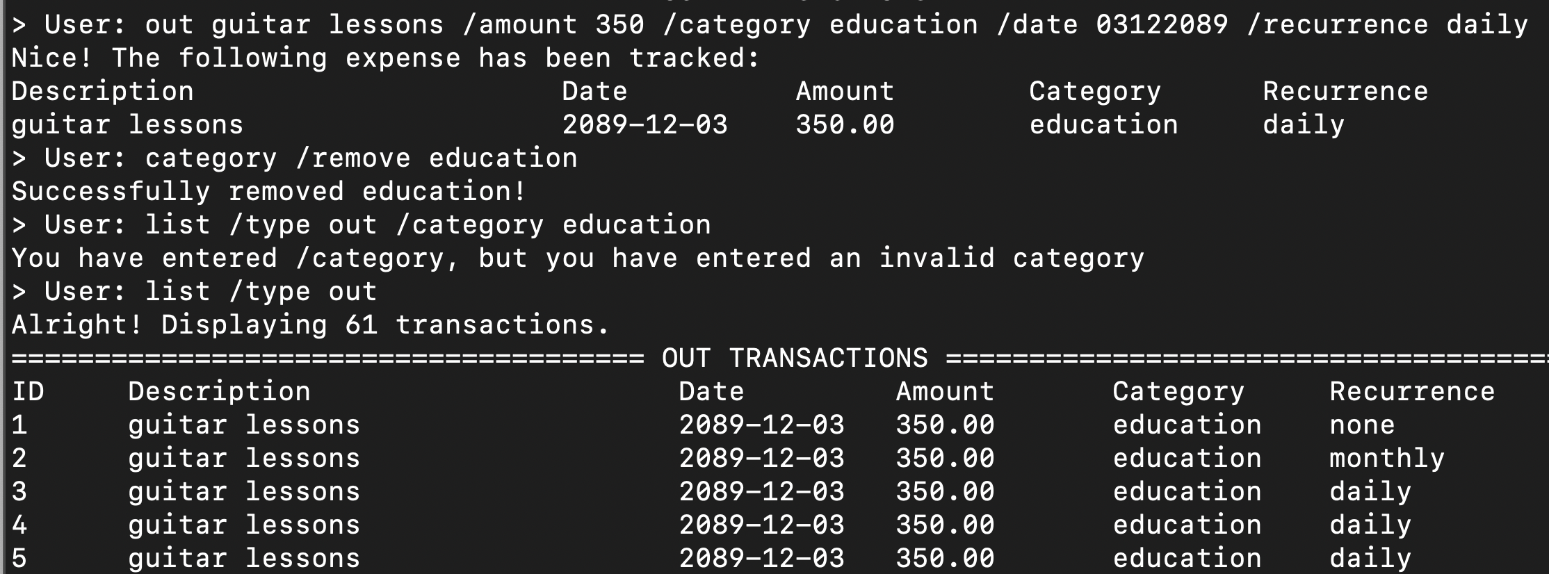 I added a transaction with the category 'education'. Then, I removed category 'education'. 'list /type out/ category education' returned no results (as expected). However, when I type 'list /type out', as shown in the screenshot, it returns transactions with the category: 'education'. So removing category command does not seem to have any functionality for the user.