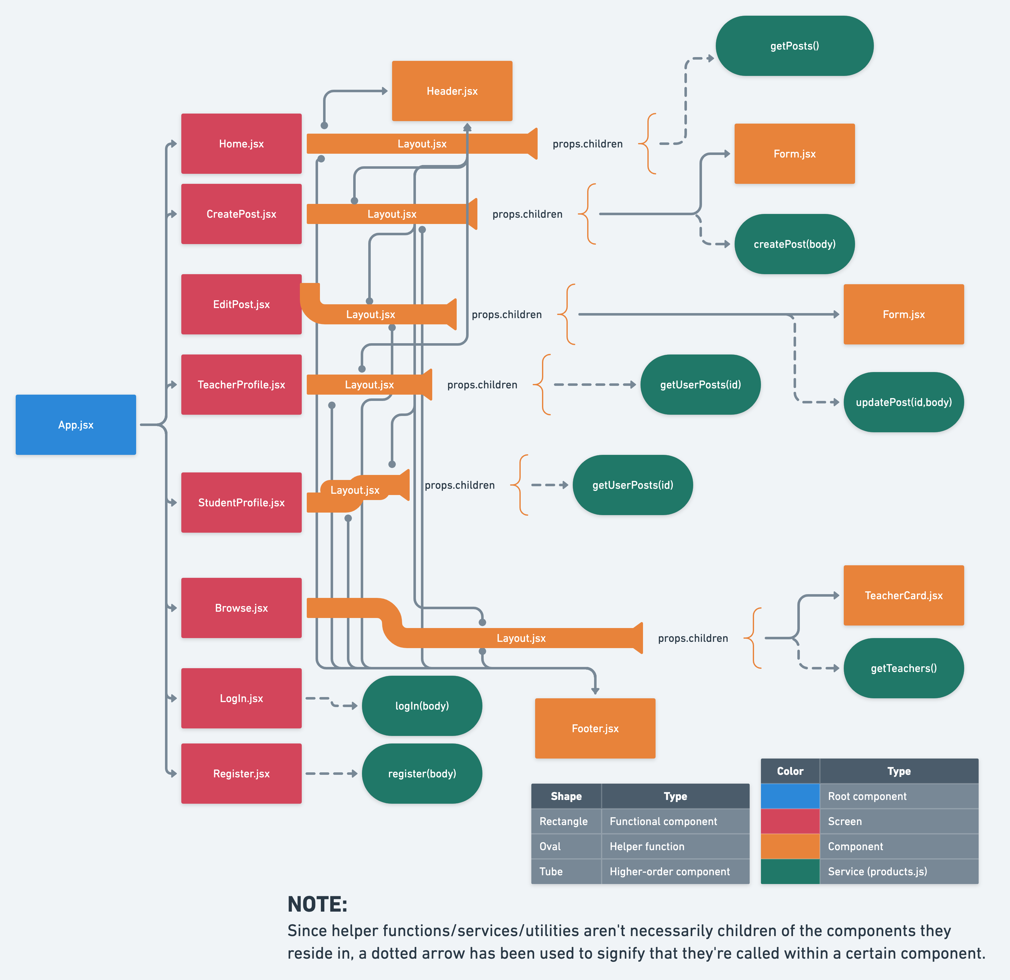 TalenTree's minimum viable product will be a functioning full-stack app that has a back-end with models for students, teachers, posts, and classes (along with the connections between each entity) and a front-end that allows users to perform full CRUD (Create, Read, Update, Delete) on the server by viewing posts and creating/editing/deleting their own posts. Teachers should be able to create their own classes that the students can then register for via a connection request (see ERD Model for structure of data). The styling will incorporate flexbox and will be responsive so the app looks good on mobile screens as well.