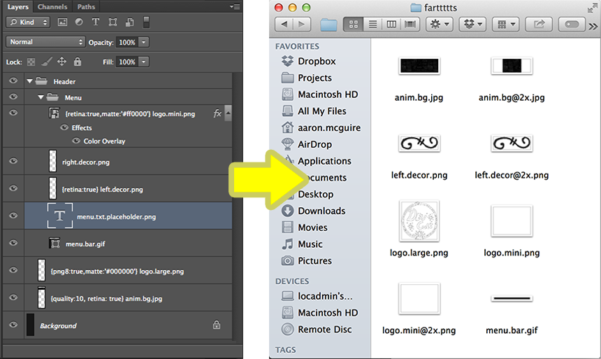 Turns a photoshop layer named: "{retina:true}logo.mini.png" into a transparent web optimized PNG named "logo.mini.png" and creates 2x retina version named "logo.mini@2x.png" in a folder that you specify... All with correct dimensions and flattened layers styles.