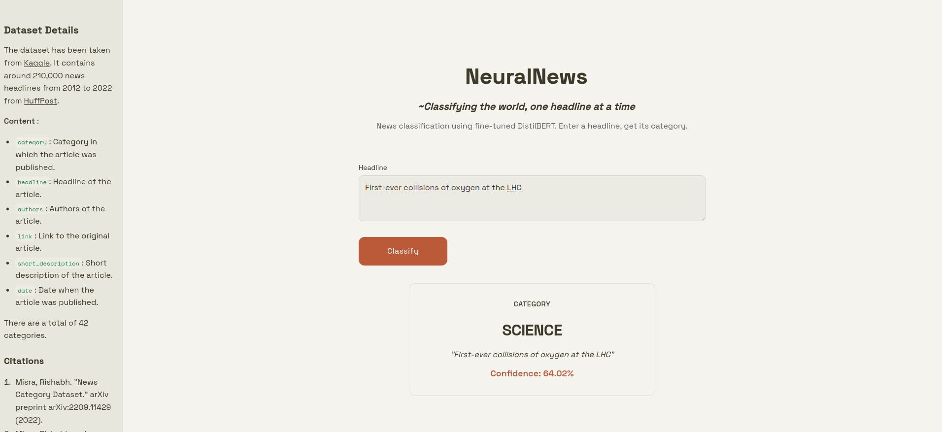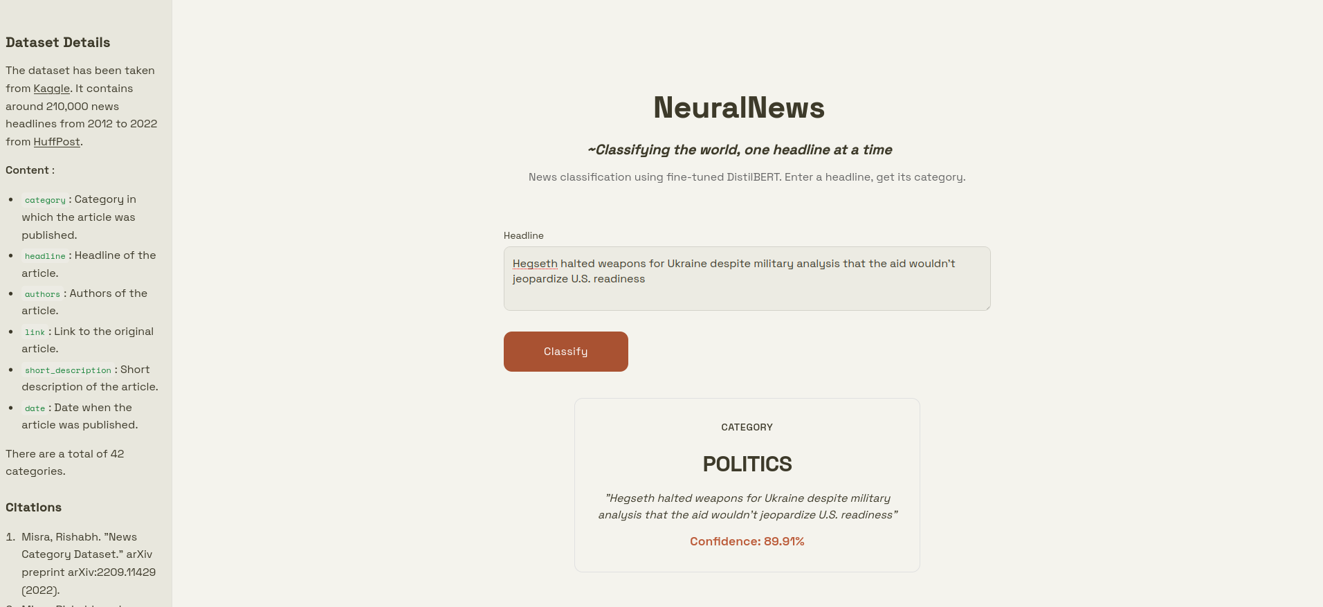 DistilBERT is a distilled version of BERT that retains 97% of BERT's language understanding whilst being 60% smaller and significantly faster. The pre-trained model has been trained on the News Category Dataset from Kaggle which consists of around 210k headlines.