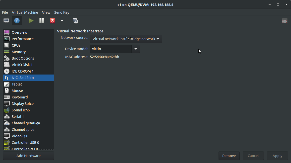 sean@Supermicro-813MFTQC:~$ brctl show bridge name bridge id STP enabled interfaces br0 8000.ac1f6b615edd yes eno2 vnet0 virbr0 8000.5254000c0d6f yes virbr0-nic