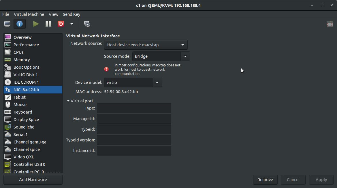 MacVTap is used when users in the LAN want to access the VM, but you don't want to create a normal Linux bridge. This connection is not used in production systems and is mostly used on a workstation-type station.