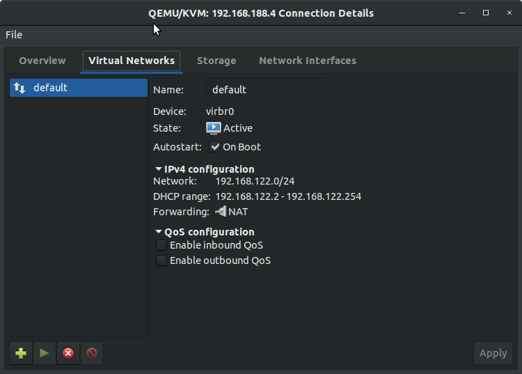 sean@Supermicro-813MFTQC:~$ virsh net-start routed Network routed started sean@Supermicro-813MFTQC:~$ virsh net-autostart routed Network routed marked as autostarted sean@Supermicro-813MFTQC:~$ virsh net-list --all Name State Autostart Persistent ---------------------------------------------------------- default active yes yes isolated active yes yes routed active yes yes