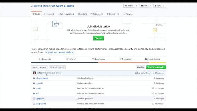 In this example, we demonstrate how to do high performance AI inference in Node.js. The computationally intensive tensorflow code is written in Rust and executed in WebAssembly. The user-facing application that uses image recognition is written in JavaScript and runs in Node.js.