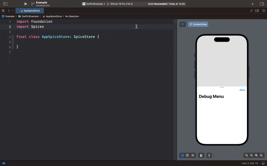 The app must be configured to display the spice editor. The approach depends on whether your app is using a SwiftUI or UIKit lifecycle.