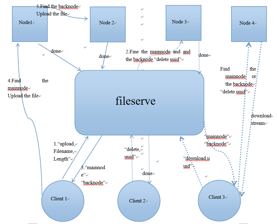 FileClient应用程序运行时,需要读取配置信息,在配置中包含了FileServer的IP和端口。注意该端口是FileServer和FileClient之间的通信端口。 FileClient进行文件上传和下载时,首先建立到FileServer的TCP连接,获取主存储节点和备份存储节点的信息。然后断掉和FileServer的连接。 之后优先和主存储节点进行通信。当和主存储节点通信失败时,再和备份节点进行通信。如果和主节点进行文件操作成功,那么主节点负责和 备份节点之间的文件同步,例如文件备份,文件删除这两个功能。
