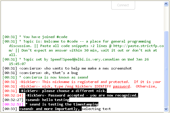 Conviersa is (was) a cross-platform IRC client written in C++ using the Qt library. It's not currently being maintained. Below is a screenshot of the chat control; you can optionally select text without timestamps: