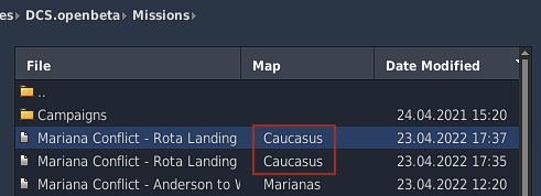 When I generate Marianas missions, sometimes the map title shows as "Caucasus" in the ME/open missions menu. See screenshot. But it is the Marianas map when the mission is opened in ME.