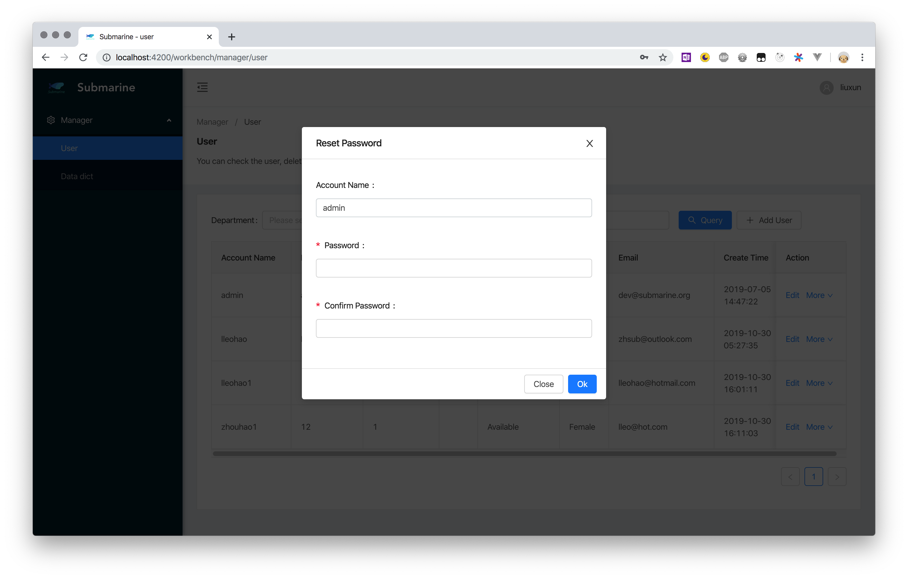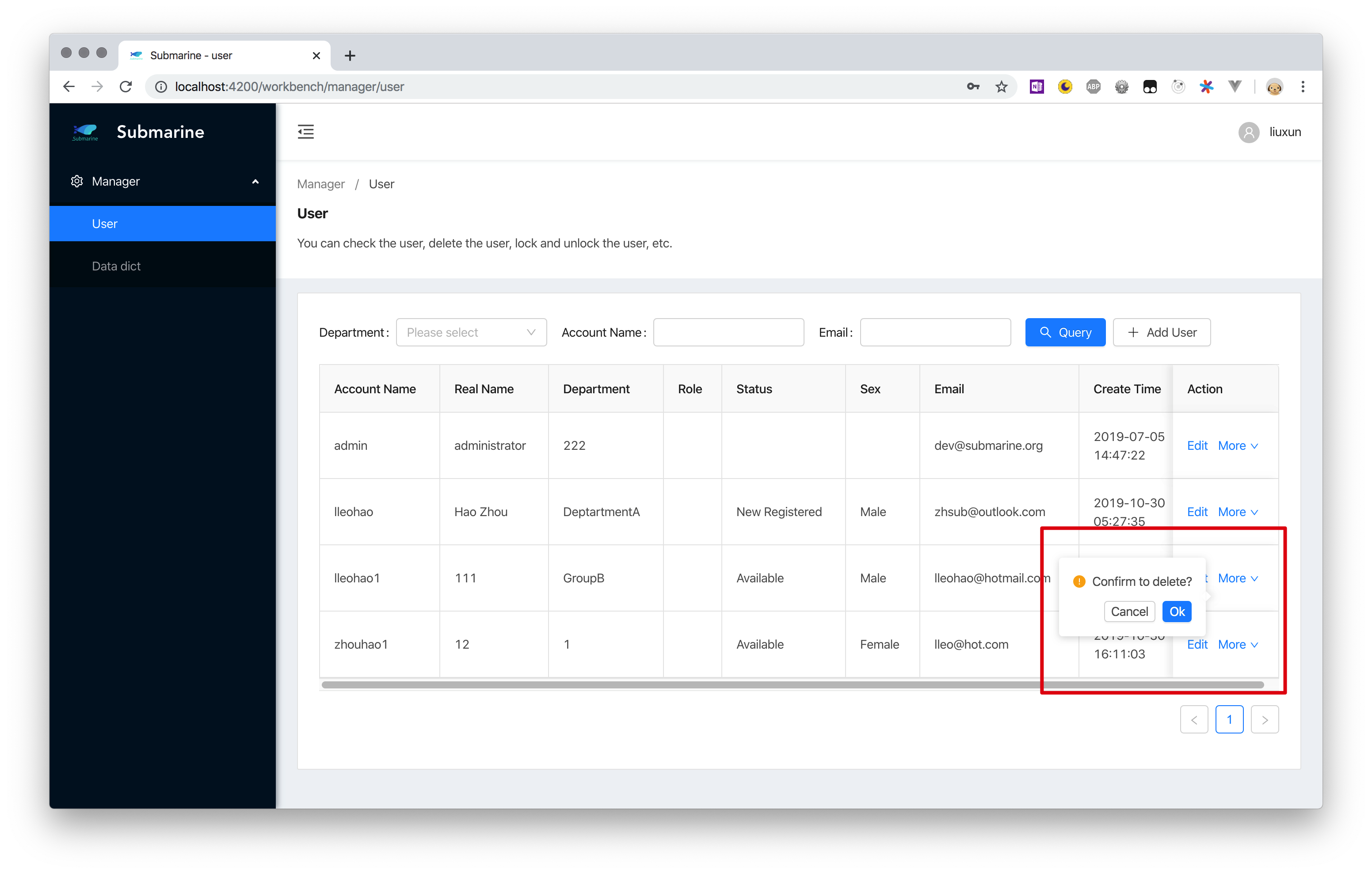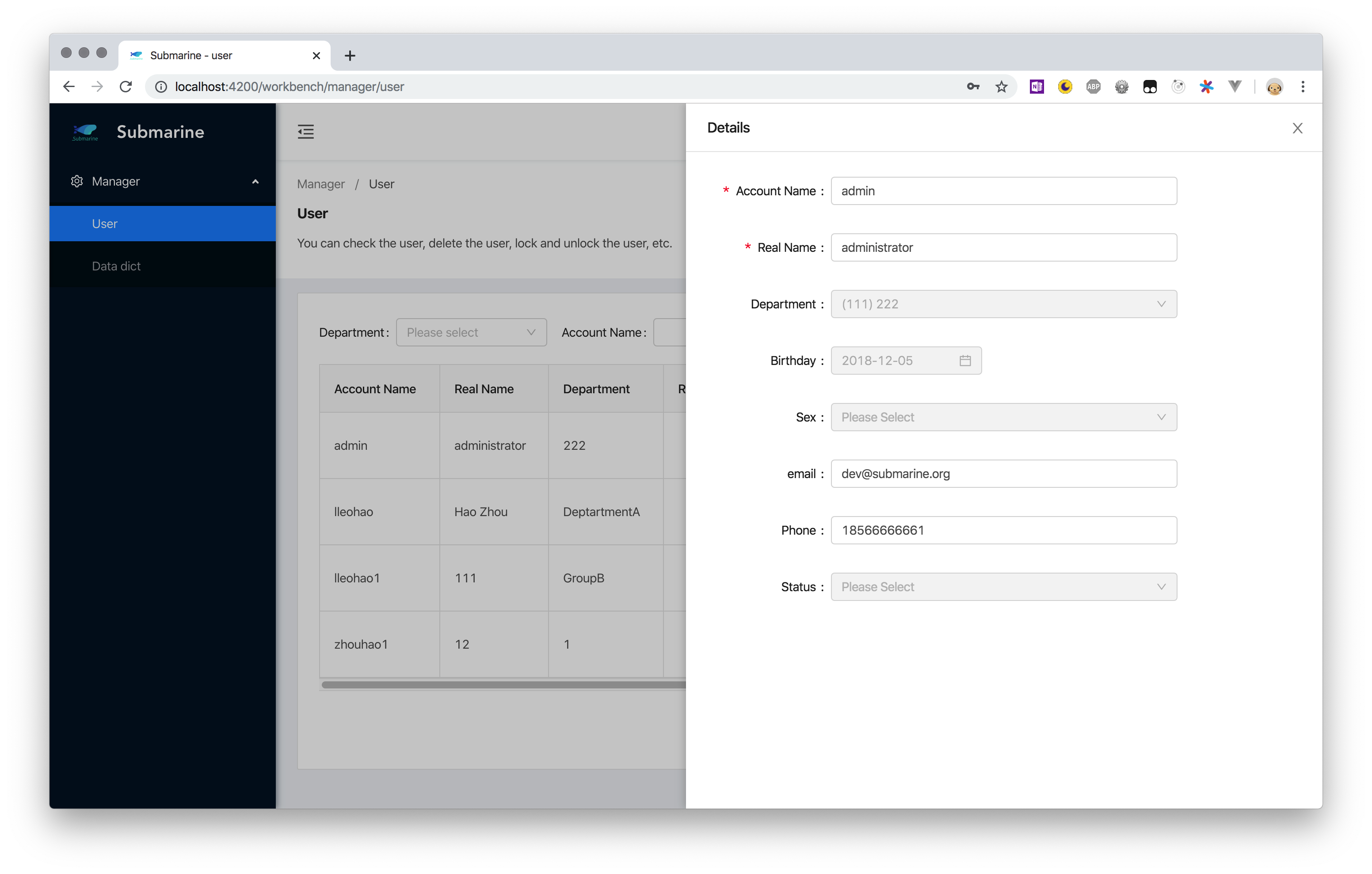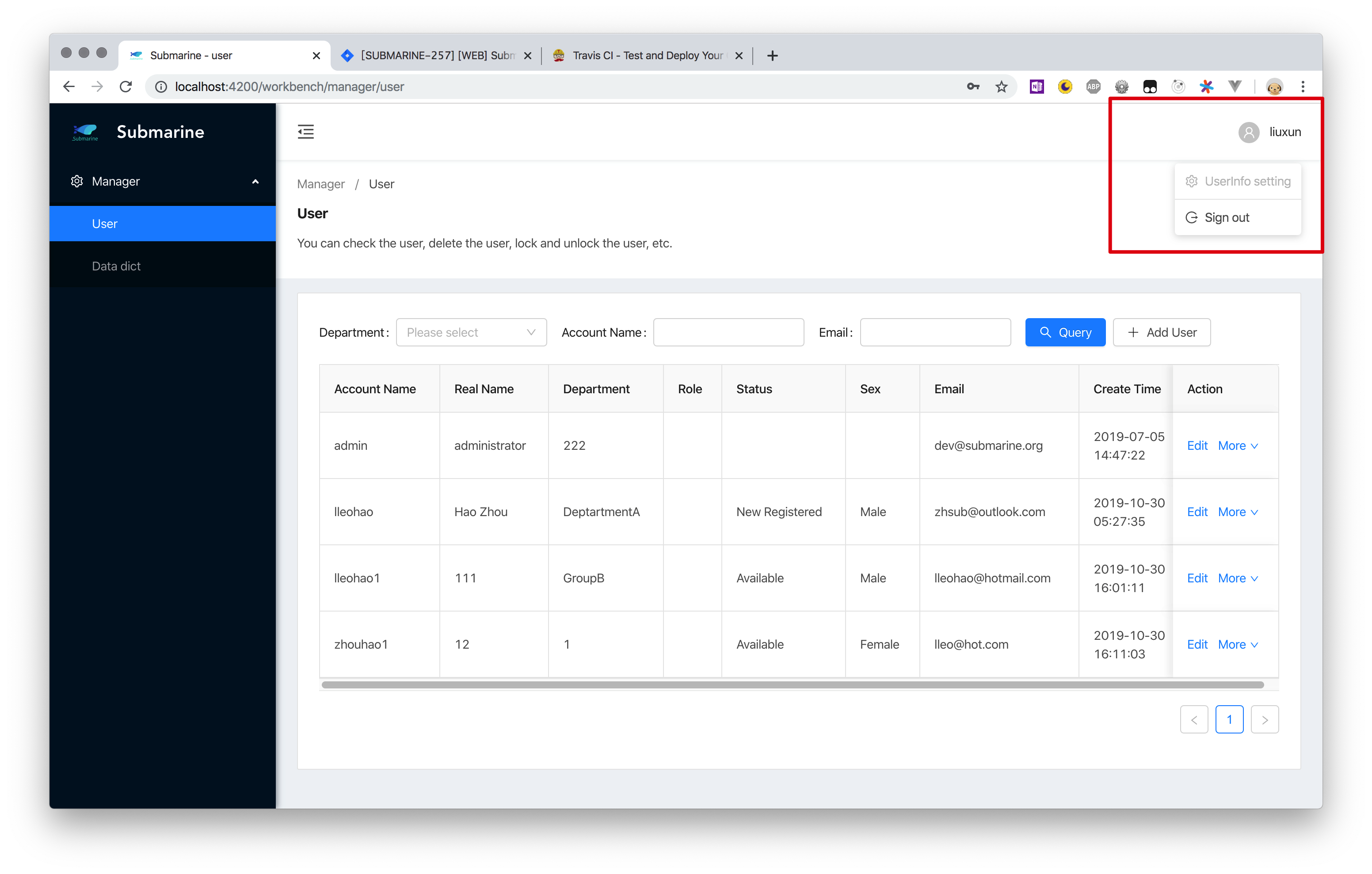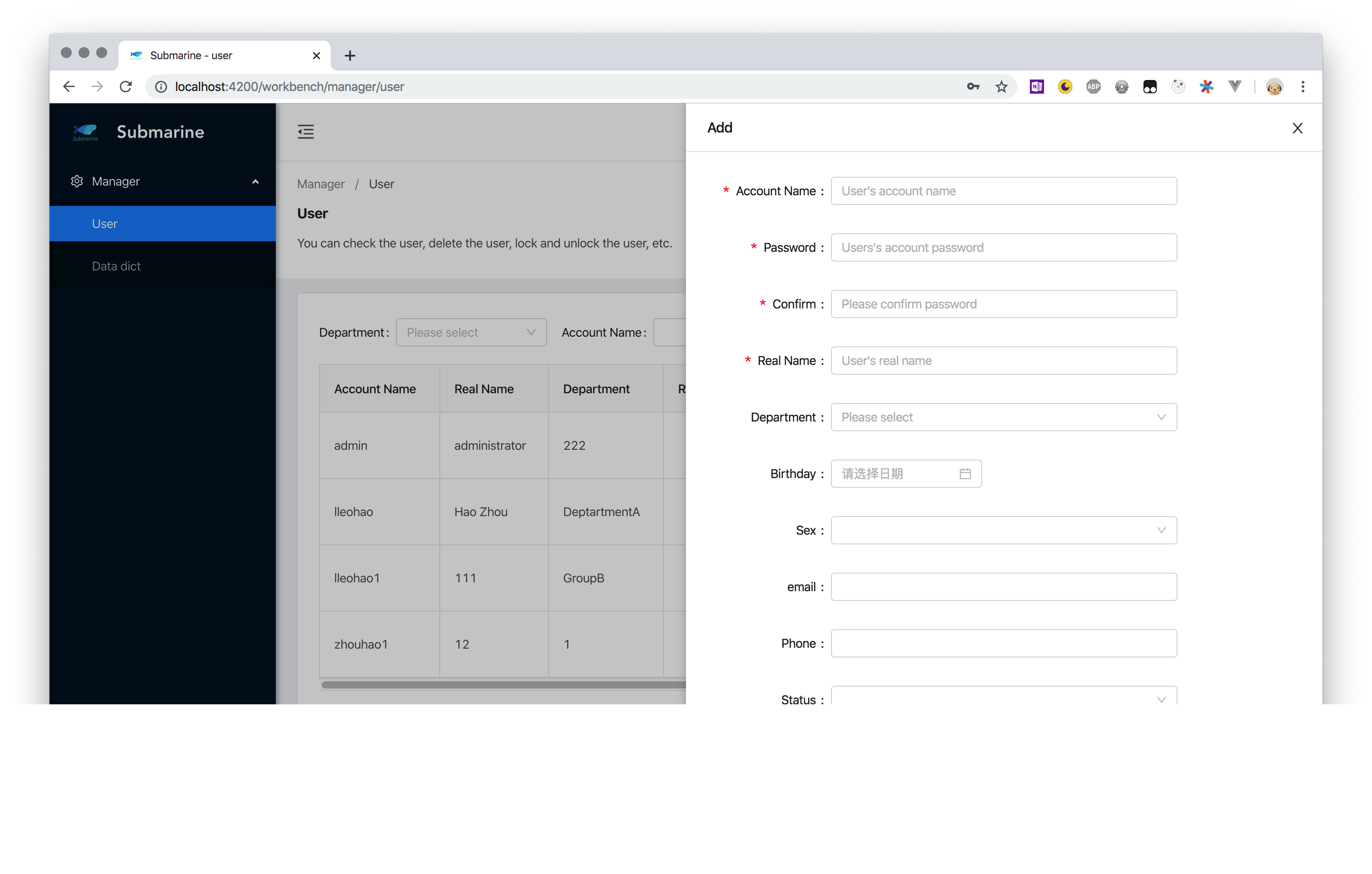 ### What is this PR for? Submarine web, add user manager page with angular ### What type of PR is it? [Feature] ### What is the Jira issue? https://issues.apache.org/jira/browse/SUBMARINE-257 ### How should this be tested? https://travis-ci.org/lleohao/hadoop-submarine/builds/609567077 ### Screenshots (if appropriate) 1. user list  2. add user  3. view user detail  4. edit user  5. change user password  6. delete user  7. Log out  ### Questions: * Does the licenses files need update? No * Is there breaking changes for older versions? No * Does this needs documentation? No Author: lleohao <lleohao@hotmail.com> Closes apache#89 from lleohao/SUBMARINE-257 and squashes the following commits: 66e7c44 [lleohao] Merge branch 'master' into SUBMARINE-257 d6ddf35 [lleohao] [SUBMARINE-257] ci: fix build ng error af4dff5 [lleohao] [SUBMARINE-257] test: fix e2e test case 79663bb [lleohao] [SUBMARINE-257] ci: add unit test b977f89 [lleohao] [SUBMARINE-257] feat: add manager user feature 3d7055e [lleohao] [SUBMARINE-257] feat: add page header and logout feature 028b399 [lleohao] [SUBMARINE-257] feat: add sidebar and logo 20b96b6 [lleohao] [SUBMARINE-257] feat: init workbench module