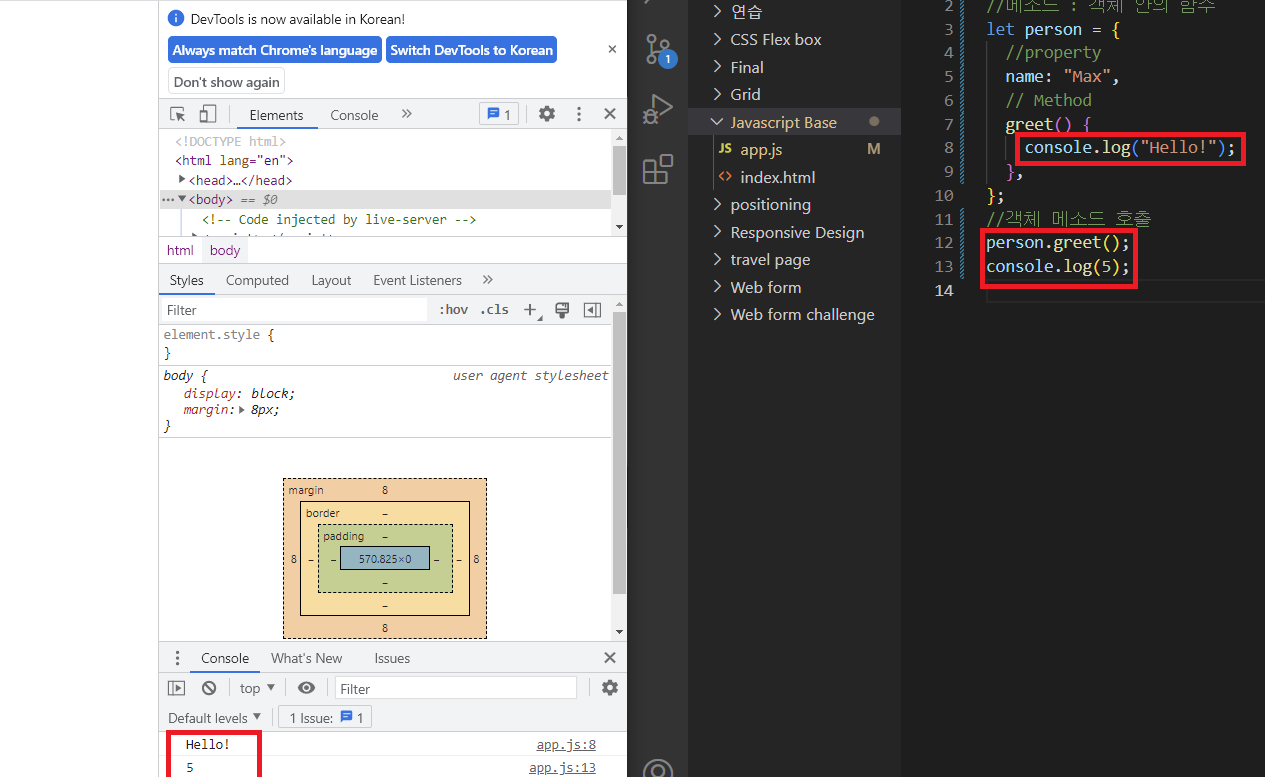 alert 창보다 console 창을 사용하면 한번에 여러 실행 결과를 볼 수 있어서 편하다.(다크 모드 시 숫자는 보라, string은 흰색으로 구분 가능)