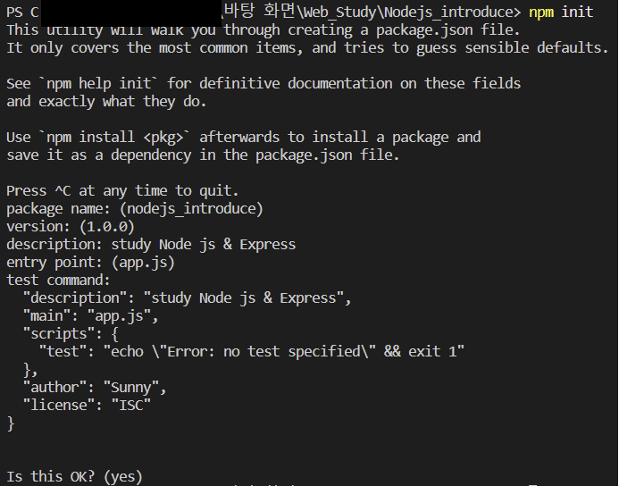 **npm 이란?** - node package manager - node js의 라이브러리 창고 **npm 설치법** - npm init 명령어 사용 - package 이름, version, 설명, 시작점 , 적는 사람, 라이선스 입력 - 마지막에 확인 ok? 하면 enter 누르고 끝 - json 파일 생성됨! -> 이 파일에서 설치하는 node 라이브러리들 볼 수 있음.  **npm 작동확인법** - npm install express 로 express 라이브러리 설치 후 package.json 파일에서 확인