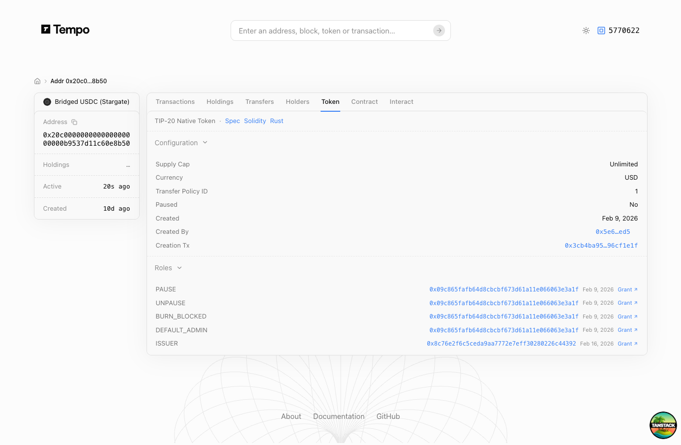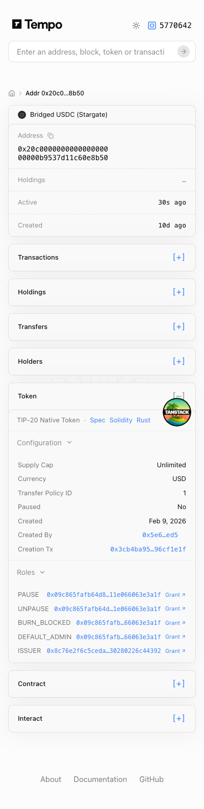 /api/tip20-rolesendpoint — queries indexedRoleMembershipUpdatedevents and fetches TIP-20 config via server-side RPCcreatedTxHashandcreatedBy(deployer)Screenshots