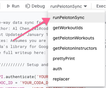 There are two scripts in this repo you can run to sync your Peloton workout data to a Coda doc. One script is meant to be run in Google Apps Scripts and the other is a Python script you can run as a traditional cron job: