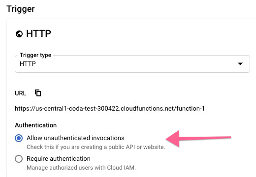 - Create a Google Cloud Function and check "Allow unauthenticated invocations":