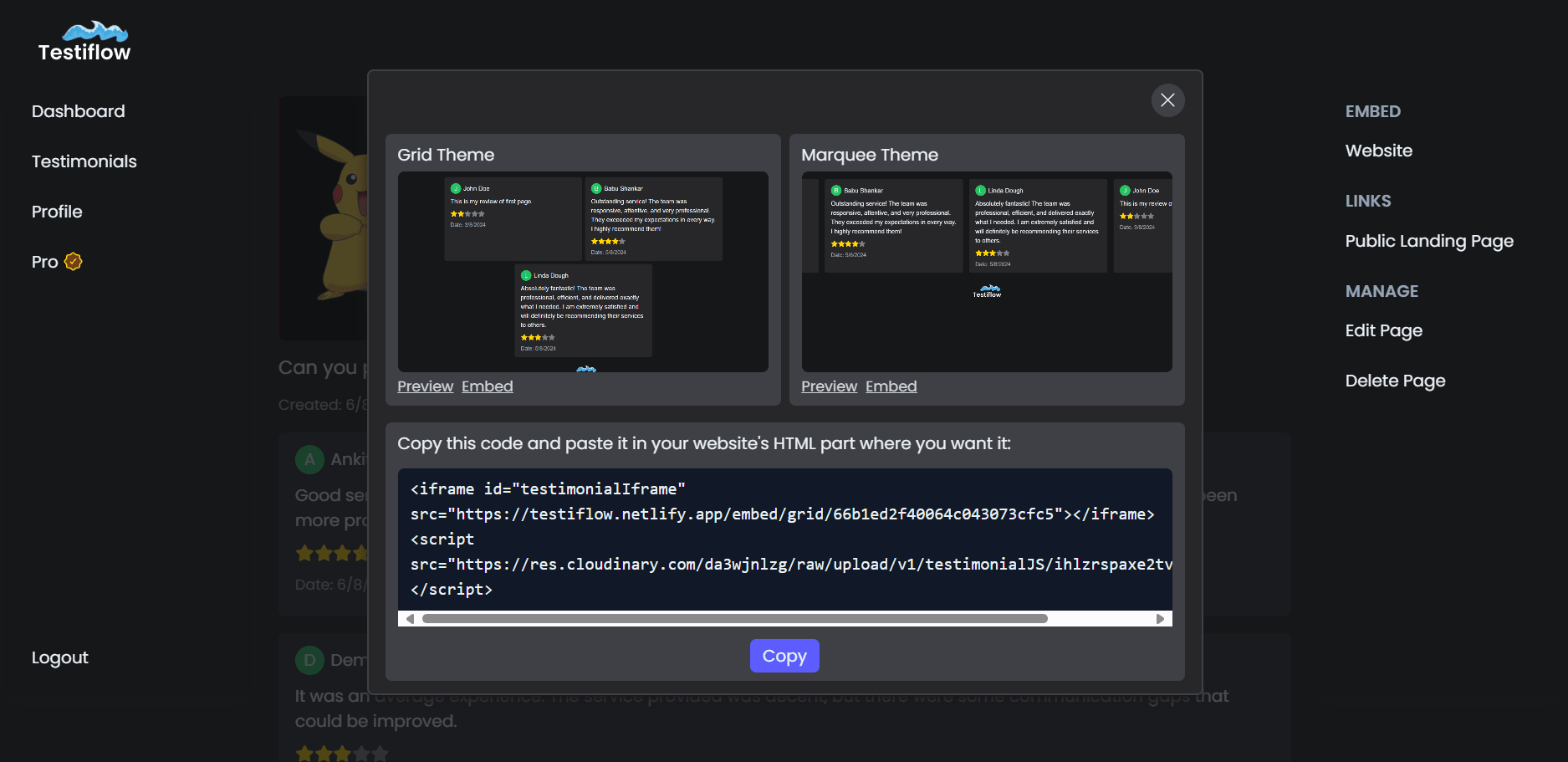 - Users can navigate to a specific testimonial page to view all the testimonials they've received. They can also select an embed theme (Grid/Marquee), copy the generated code, and easily integrate it into their website.