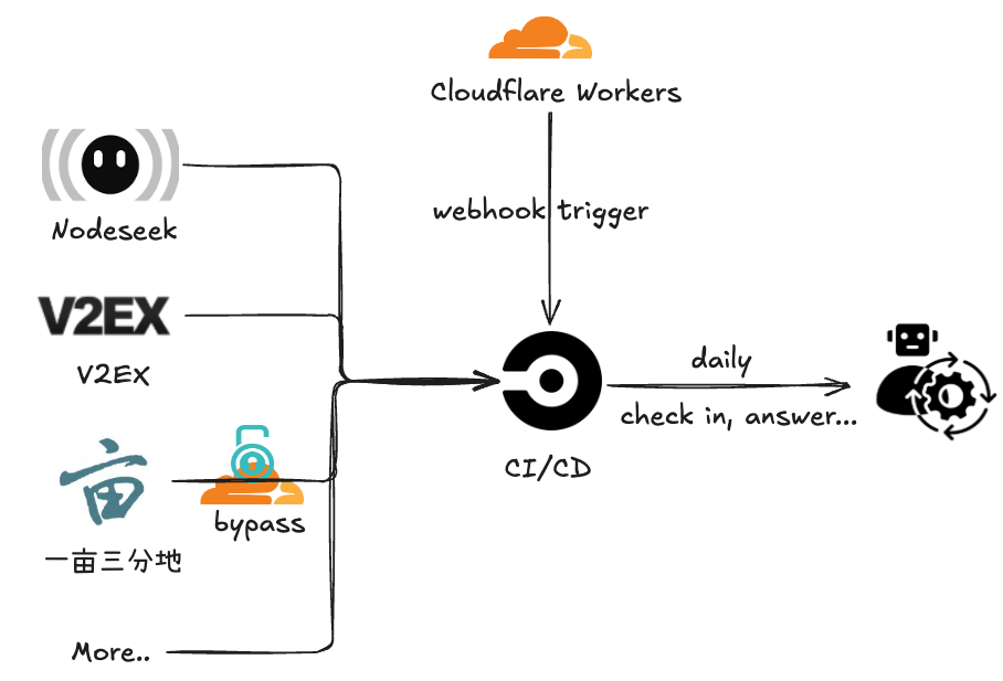 每天自动完成平台任务,完成以后会通过 telegram 机器人通知,如果失败则会直接通过 CircleCI 发送邮件通知。