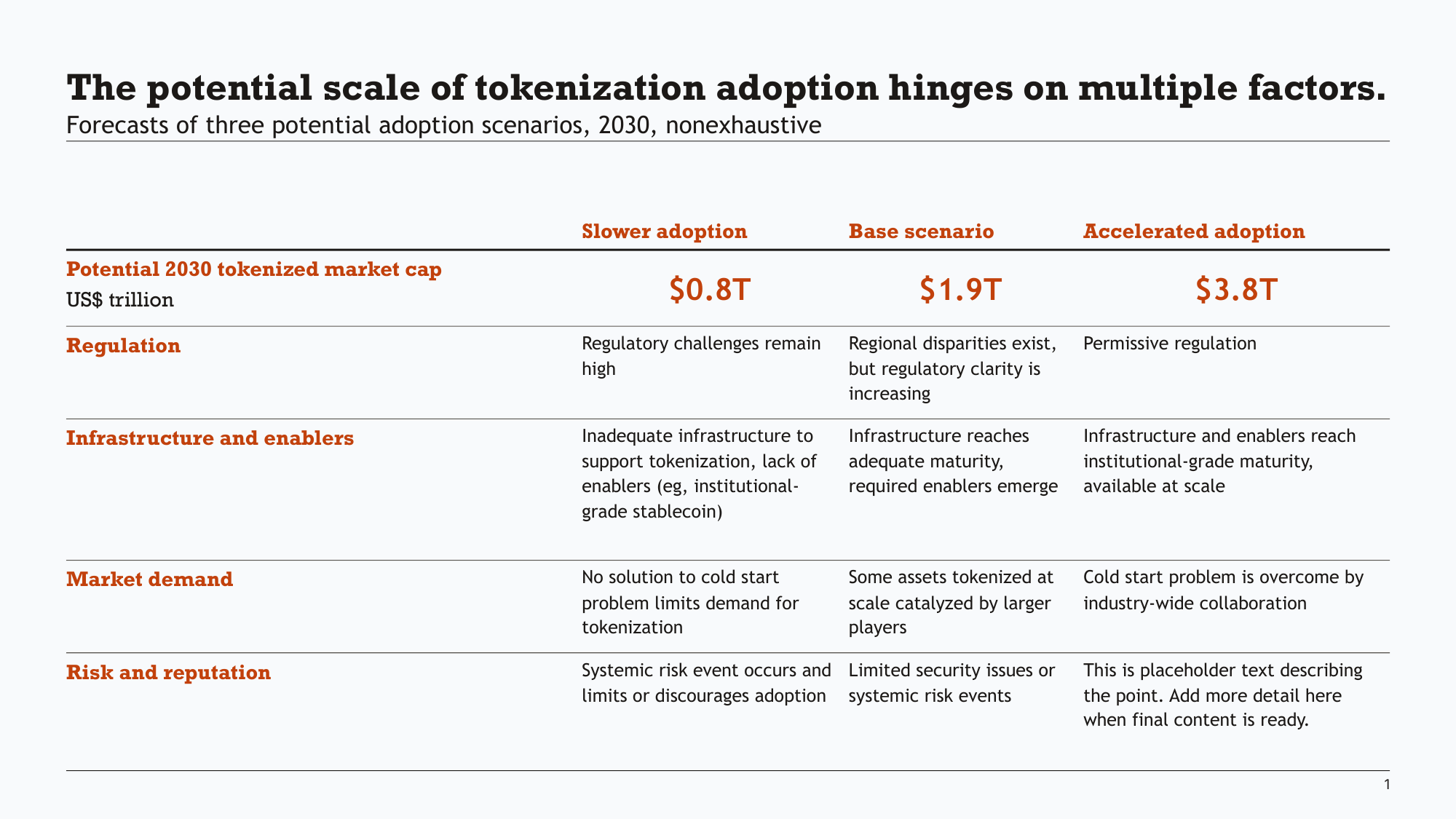 - ["Inadequate infrastructure to support tokenization, lack of enablers (eg, institutional-grade stablecoin)", "Infrastructure reaches adequate maturity, required enablers emerge", "Infrastructure and enablers reach institutional-grade maturity, available at scale"]