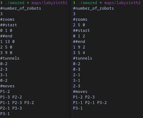 Usage: ./amazed < [map]The result of this project is an perfect A-maze-D.
