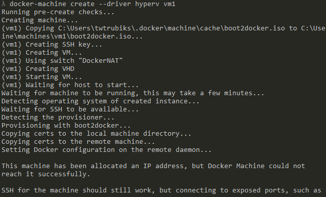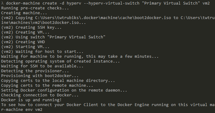 docker-machine create -d hyperv --hyperv-virtual-switch "Primary Virtual Switch" vm2