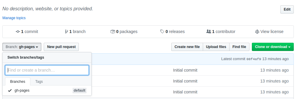 Go into your newly-created repository, ensure you are on the gh-pages branch by clicking on the branch under the drop down in the menu bar (see the note below):