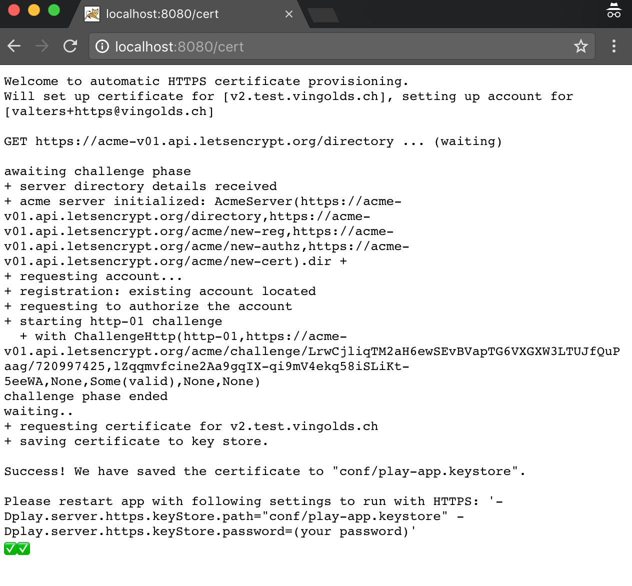 Open http://localhost:8080/cert in browser. The certificate request (or renewal) progress is shown in output and also is logged (so keep an eye on the logging messages flying by). Make sure to route the 80 port and 433 port from your router to your actual IP where app is running (ports 8080 and 9443 respectively).