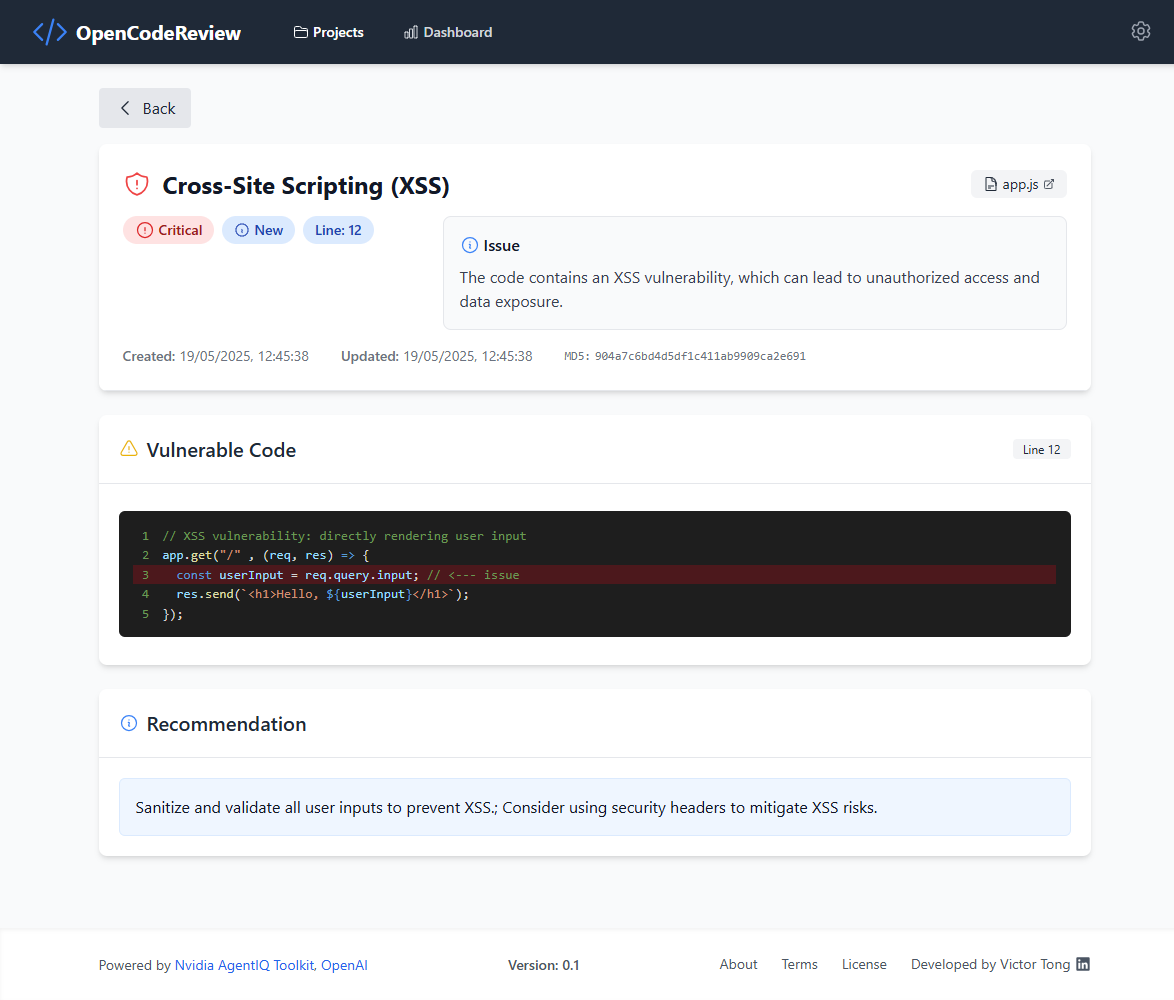 OpenCodeReview is an advanced AI-powered source code review tool and vulnerability management system that leverages NVIDIA NeMo Agent Toolkit (NAT) for intelligent security analysis and code assessment.
