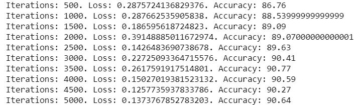 Neural Network was created using 60000 training examples, and is tested on 10000 examples. I got an Accuracy of 90.6 % after 5000 iterations using the following Program Architecture -