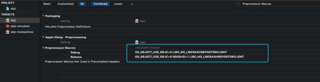 'CrashReporterClient.h' file not found;这个需要在编译设置(Build Settings添加宏变量Build Settings->Preprocessor Macros中加入:LIBC_NO_LIBCRASHREPORTERCLIENT)