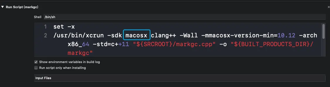 解决:把Target-objc的Build Phases->Run Script(markgc)里的内容macosx.internal改为macosx,这里猜测macosx.internal为苹果内部的macosx