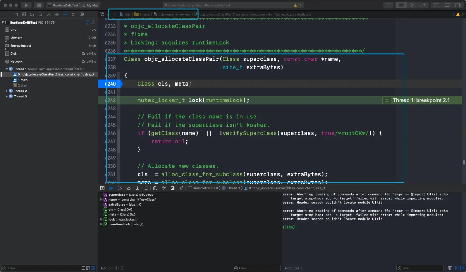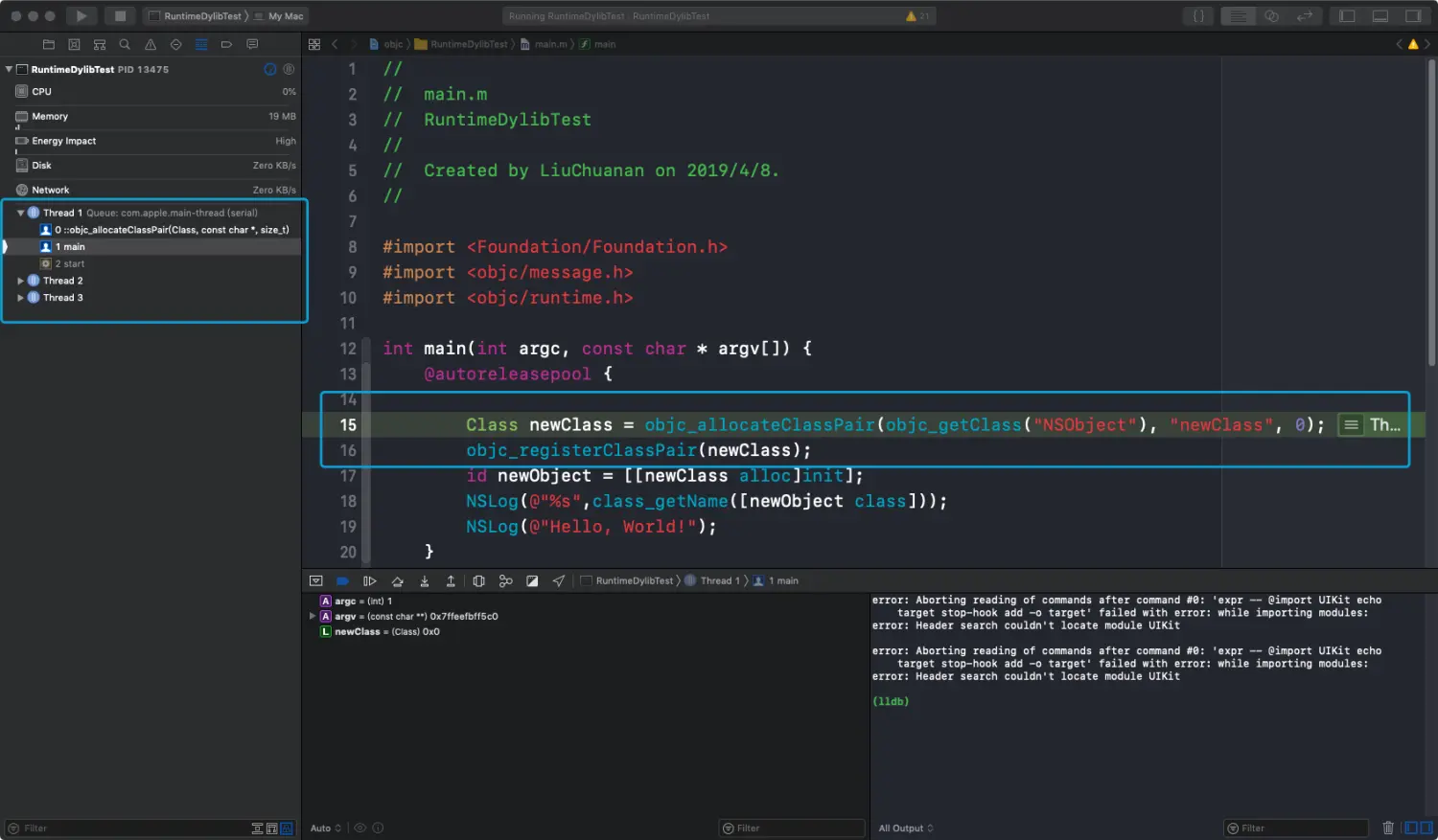 新创建一个class,命名为newClass,打印出class name.可以查看调用栈,确实调用的是我们编译后的Runtime库: