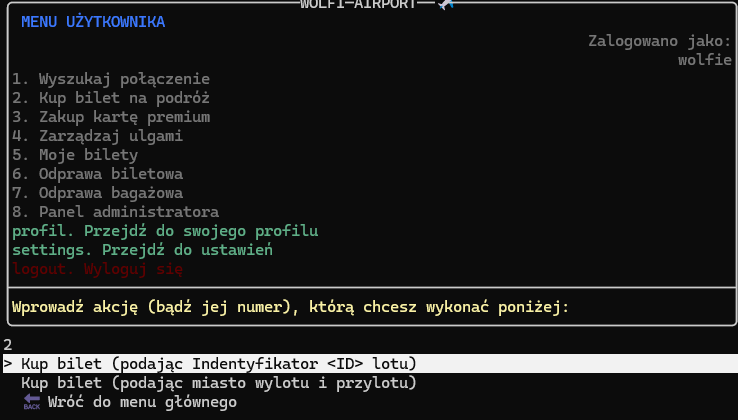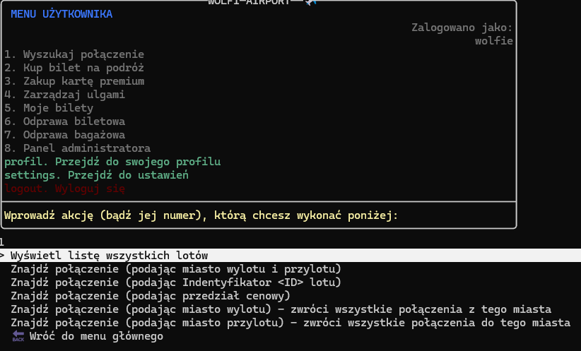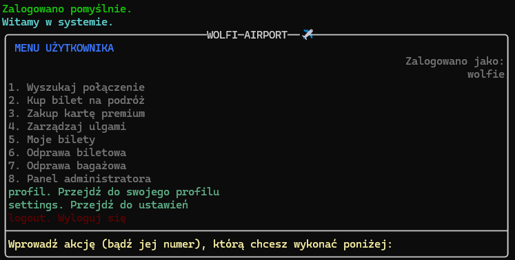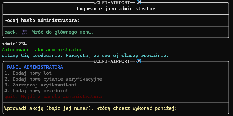 Aplikacja oferuje również panel administratora, dla osób posiadających przepustkę wyższego stopnia do siedziby biura Wolfie Airlines (hasło administratora)