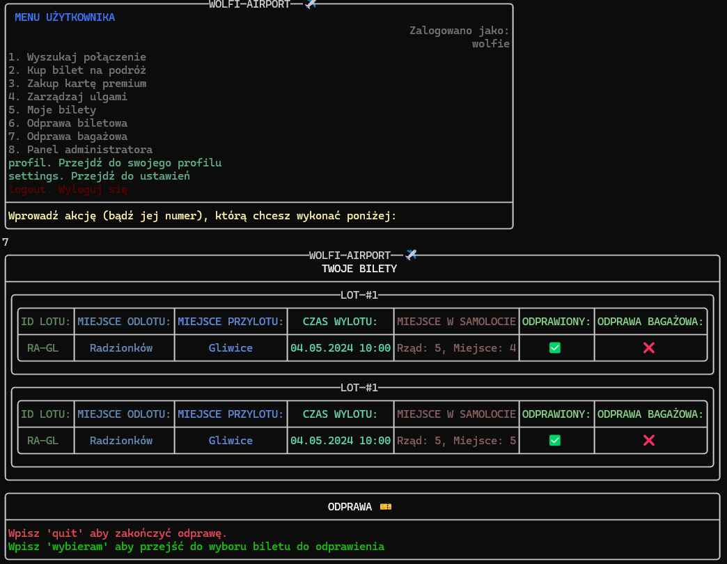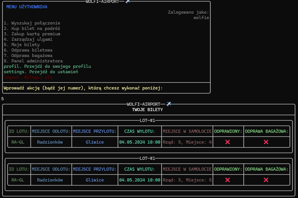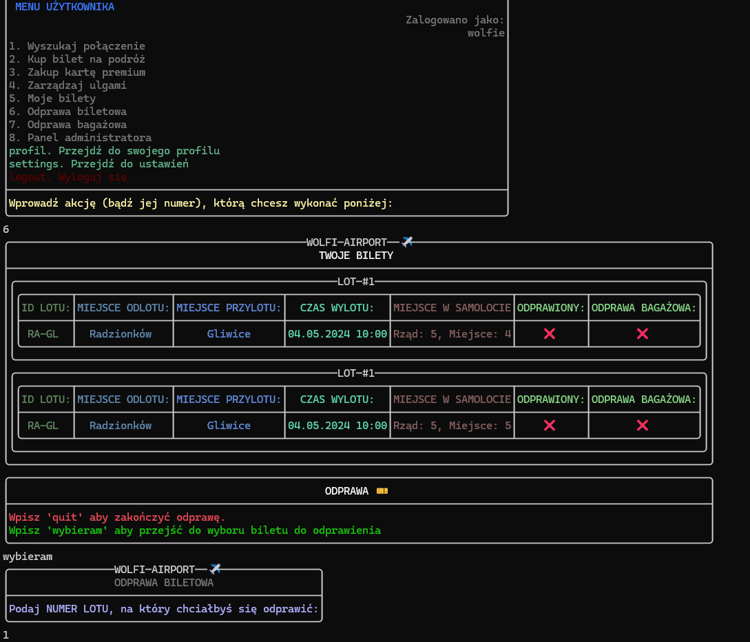 Użytkownik ma oczywiście możliwość zobaczenia zakupionych biletów oraz ich statusów odpraw (bagażowej i biletowej)